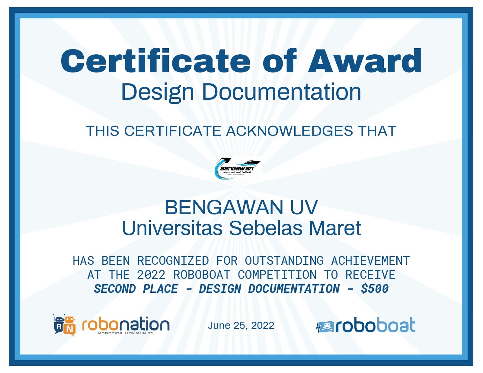 3rd Championship FERC, 4th Championship ERC, and Winner of Fun Battle FERC on KKCTBN 2nd Place Design Documentation, Blue Robotics Awards, and Best Team for Testing and Innovation on Roboboat 2022